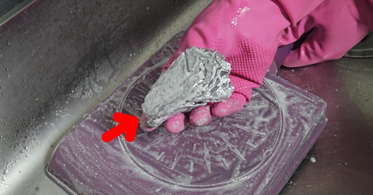- 이제 호일을 손에 감싸 동그랗게 뭉친 뒤 프라이팬 탄거 제거를 위해 원을 그리며 문질러 주세요. 기름때가 눈에 띄게 벗겨지는 모습을 볼 수 있습니다.